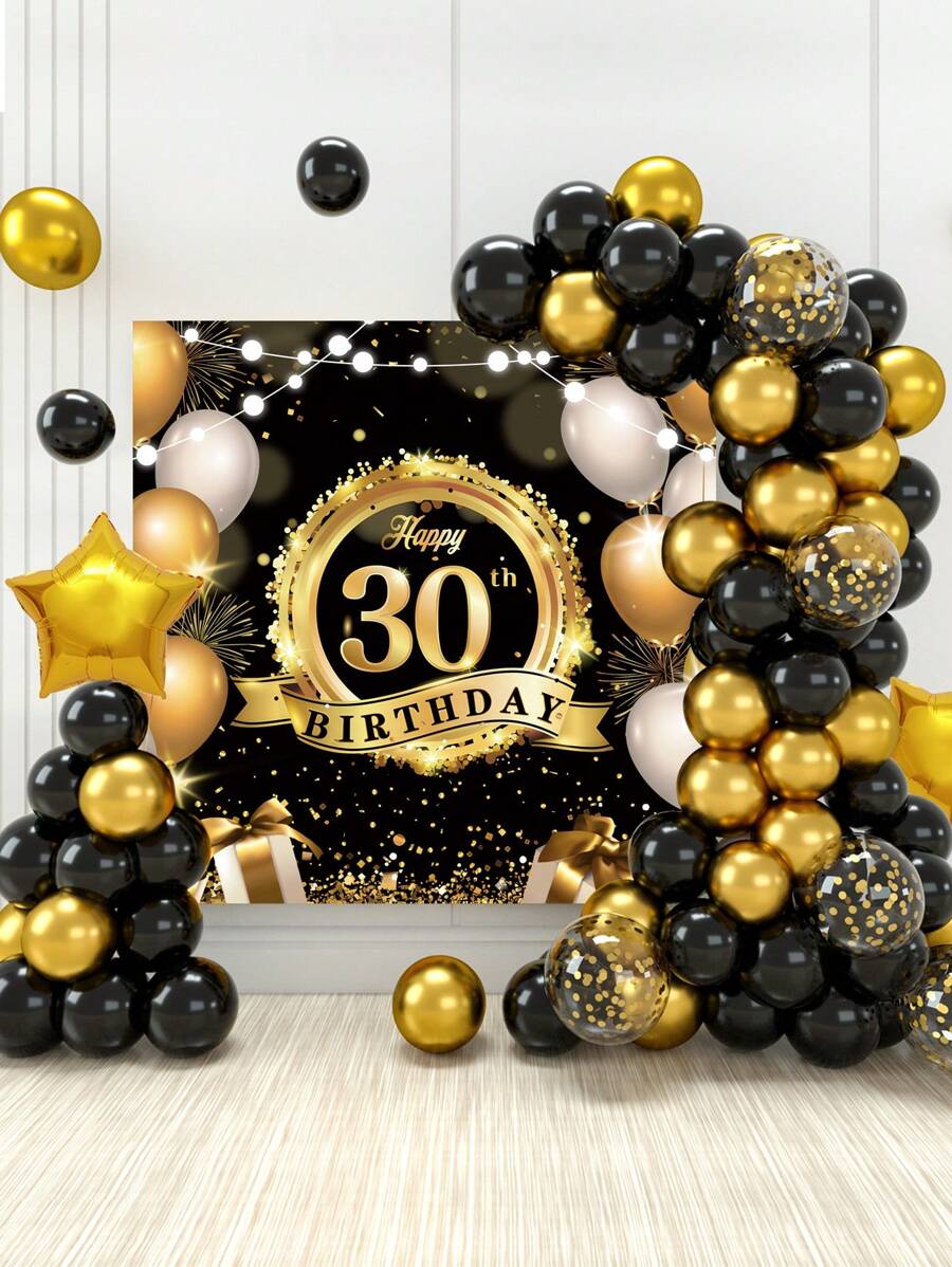 70pcs/Set Black Gold Style 30th Birthday Confetti Balloon Chain Set Included 1pc Black Gold Birthday Backcloth & 2pcs Balloon Accessory, Black Gold Theme 30 Years Old Birthday Party Wall Background Decor Balloon Set, Decorative Balloon Arch Kit, Thirty Birthday Party Decor