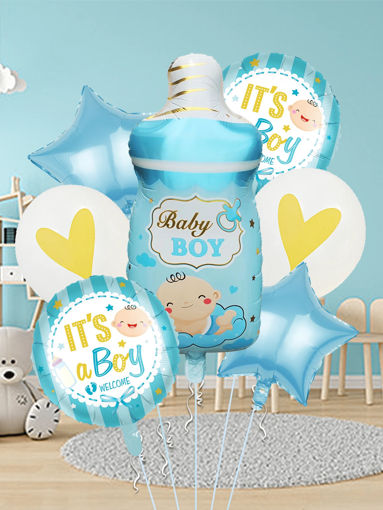 7pcs Blue Milk Bottle Shape Latex & Foil Balloons For Gender Reveal Birthday Party Scene Decoration Supplies