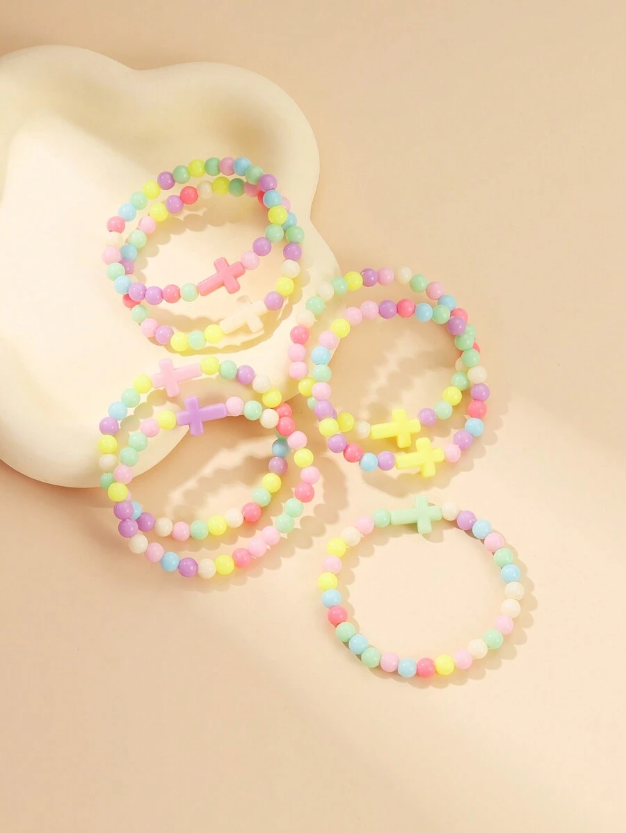 7pcs College Style Colorful Cross Beaded Elastic & Acrylic Bracelet Set - A Gift For Graduation Season