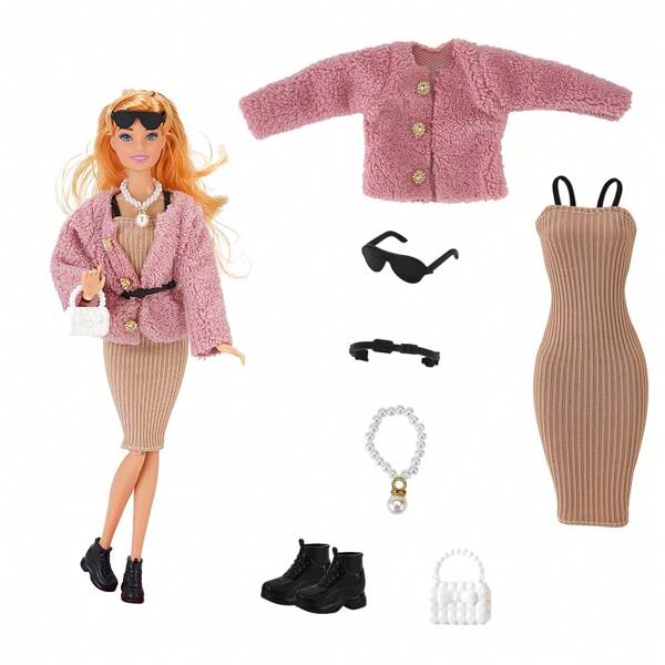 7pcs/Set 11.5 Inch Doll Clothing & Jewelry Set = 1 Outerwear + 1 Long Dress + 1 Bag + 1 Necklace + 1 Pair Of Shoes + 1 Belt + 1 Glasses (Doll Not Included), Holiday Gift