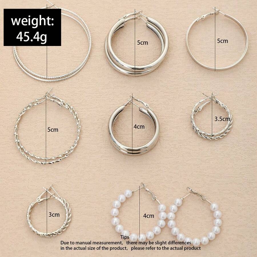 8 Pairs Simple Metallic Exaggerated Hoop Earrings With Pearl Detail In Silver Tone