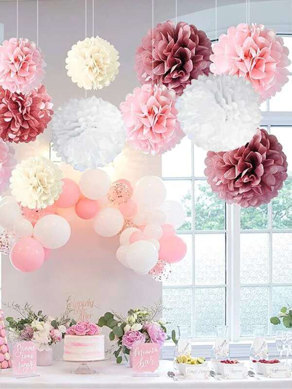 8pcs Paper Party Decoration Set For Bridal Baby Birthday Wedding, Including Pom Poms, Paper Fans And Lanterns In White, Beige And Pink, Suitable For Baby Shower, Wedding, Birthday, Party Decorations