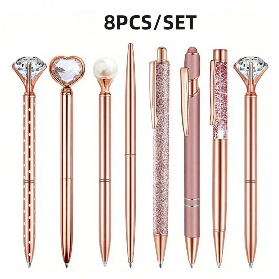 8pcs/set 1mm Rose Gold Ballpoint Pens With Black Refills, Liquid Sand Glittering Metal & Artificial Diamond Decor Pen, New Creative Multicolor Diamond Ballpoint Pens, Perfect For Gifting Friends, Classmates, Students, As Gift And Wedding Supplies.