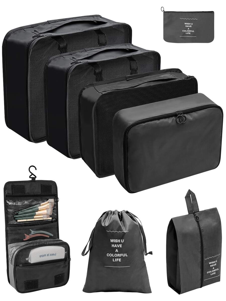 8pcs/set Polyester Travel Storage Bag, Minimalist Black Slogan Graphic Foldable Travel Backpack For Travel