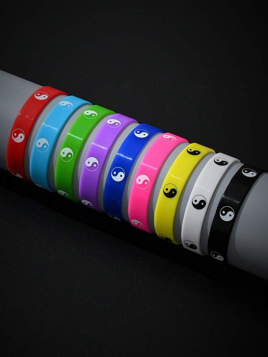 9pcs Random Multicolor Silicone Tai Chi Pattern Printed Sporty Wristband For Men And Women, Ideal Gift For Friends And Couples