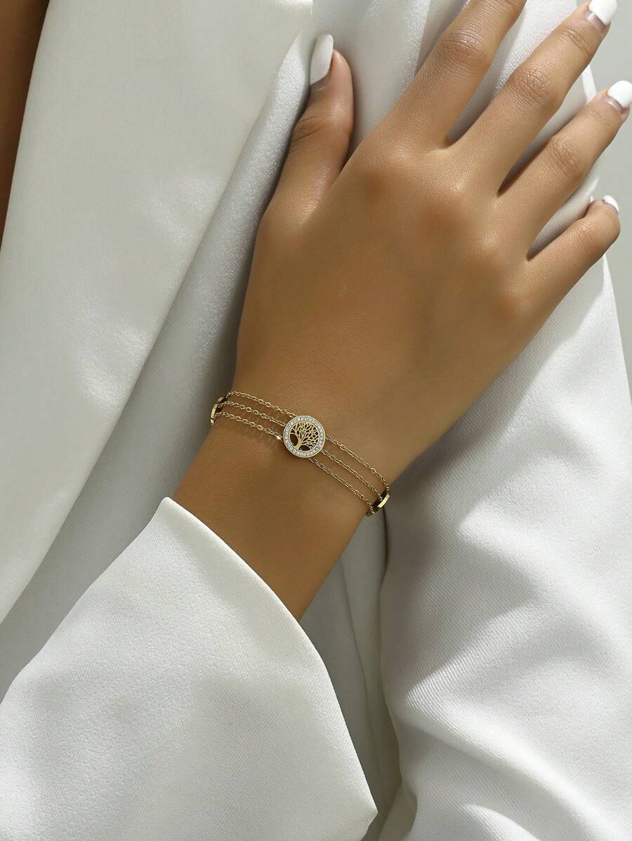 A European and American style tree of life white enamel Rhinestone three layer wear light luxury fashion trend women's stainless steel bracelet suitable for daily wear