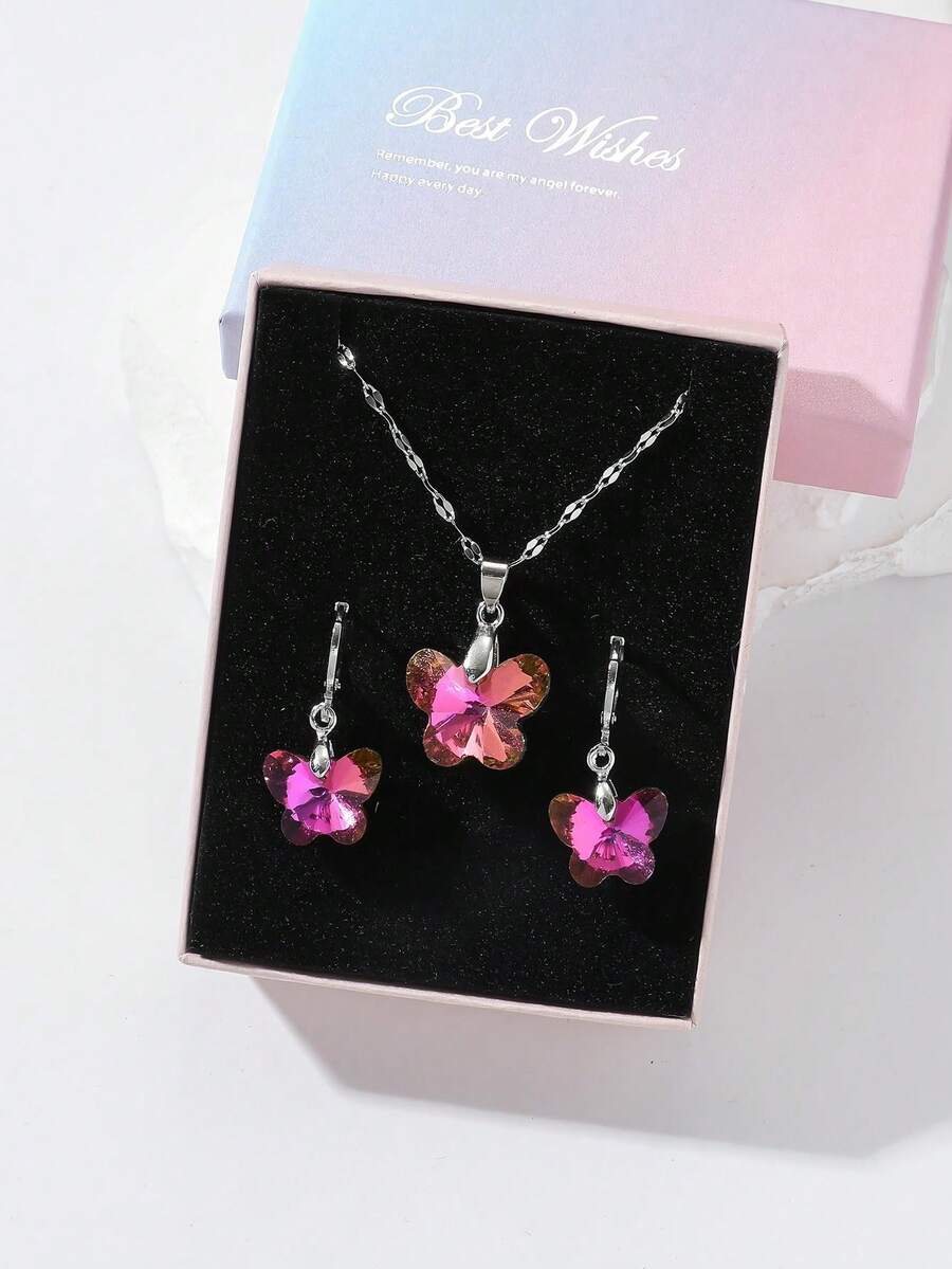 A Fashionable And Exquisite Rose Red Light Butterfly Crystal Necklace And Earrings Suitable For Women And Girls To Wear At Daily Gatherings