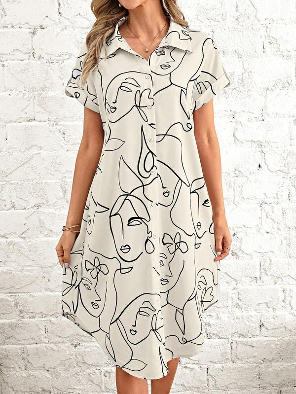 EMERY ROSE Abstract Figure Graphic Curved Hem Shirt Dress Without Belt