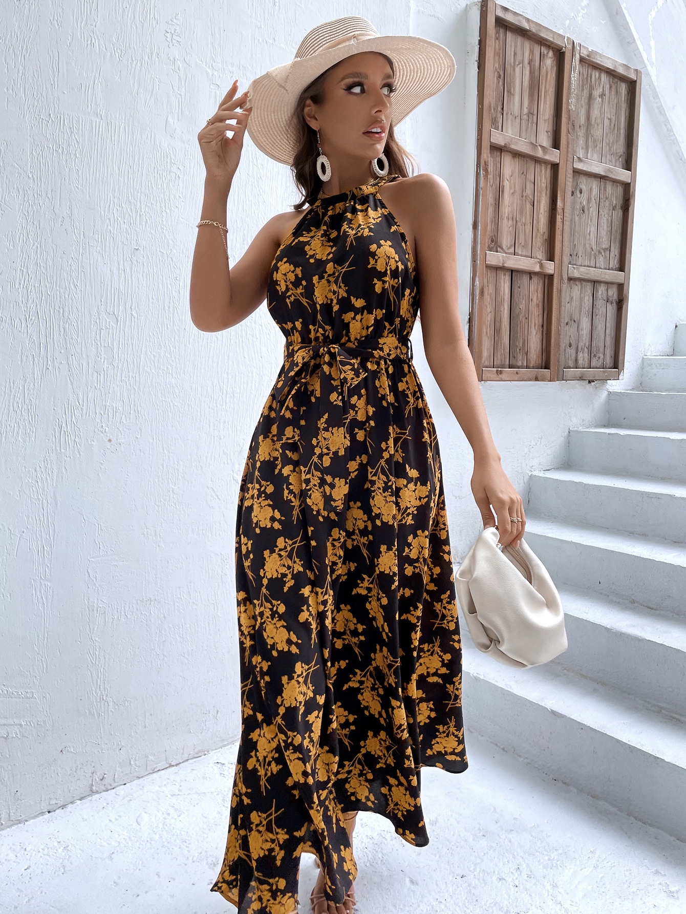 SHEIN VCAY Allover Floral Print Belted A-line Dress
