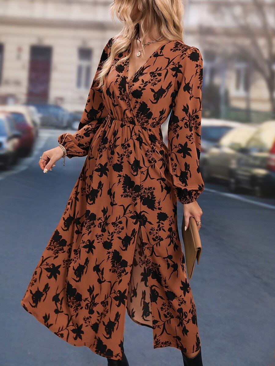 SHEIN LUNE Allover Floral Print Bishop Sleeve Split Thigh Dress