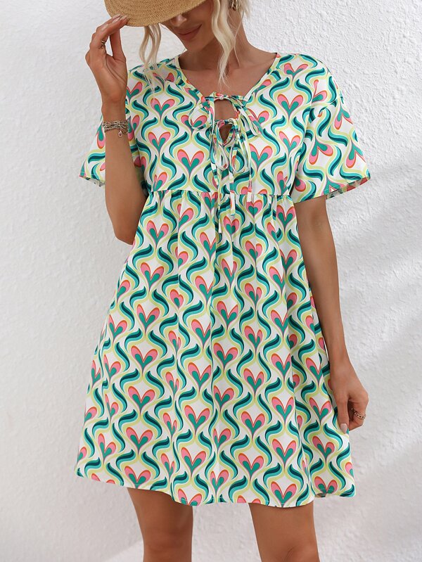 SHEIN VCAY Allover Heart Print Tie Neck Smock Dress