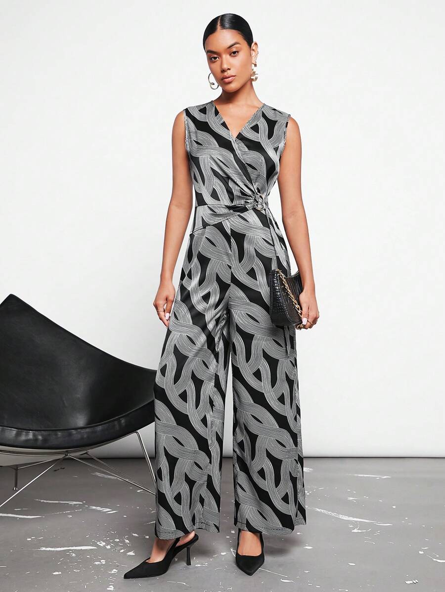 SHEIN BIZwear Allover Print D-ring Knot Side Wide Leg Jumpsuit Workwear