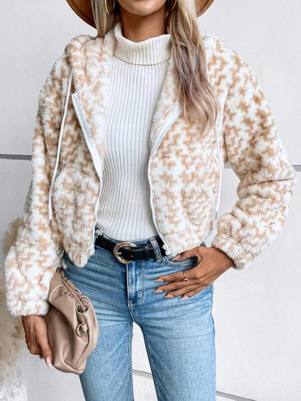 SHEIN LUNE Allover Print Drop Shoulder Drawstring Hooded Fleece Jacket