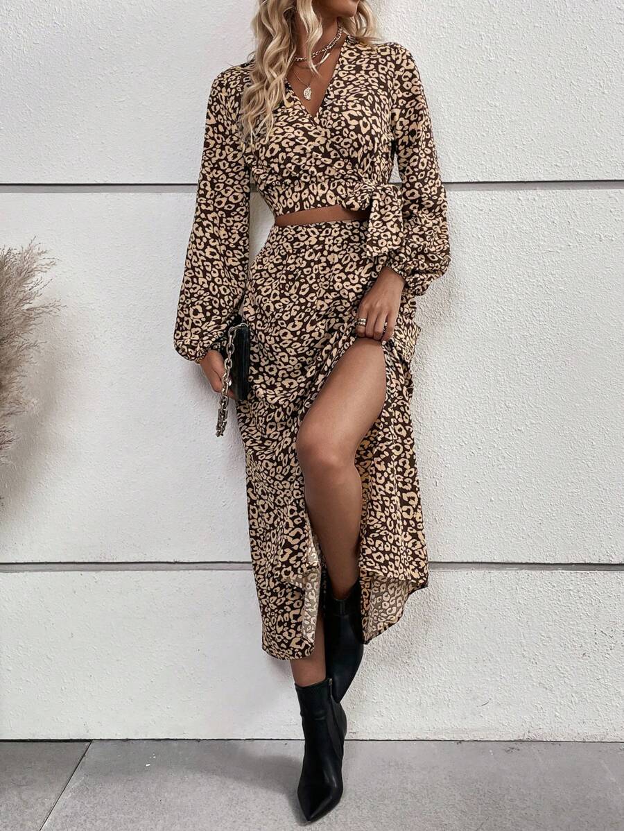 SHEIN LUNE Allover Print Lantern Sleeve Knot Side Crop Top & Split Thigh Skirt