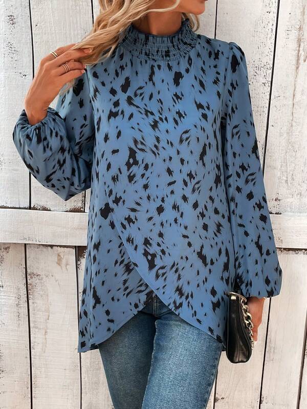 Allover Print Lantern Sleeve Wrap Hem Blouse
