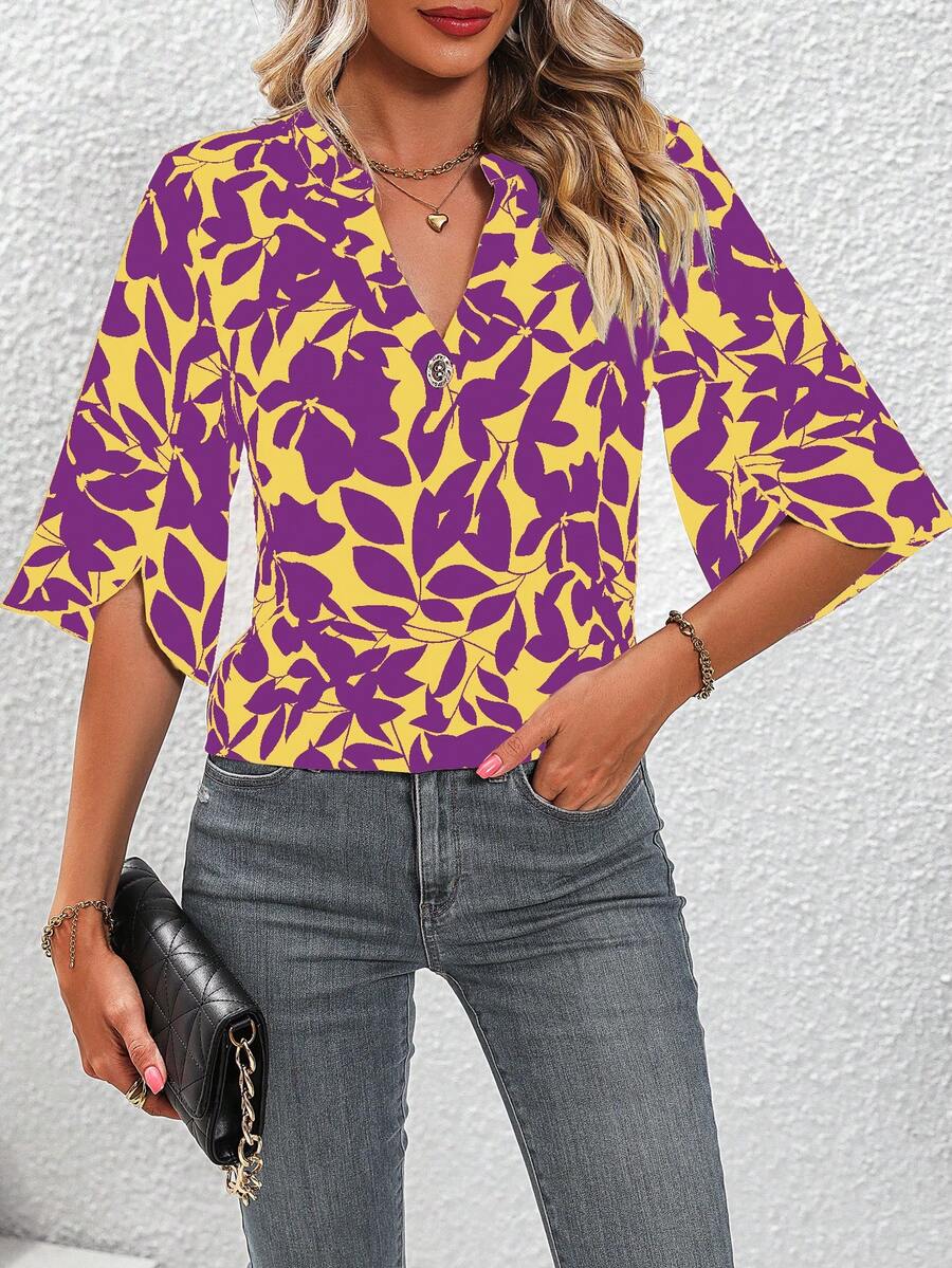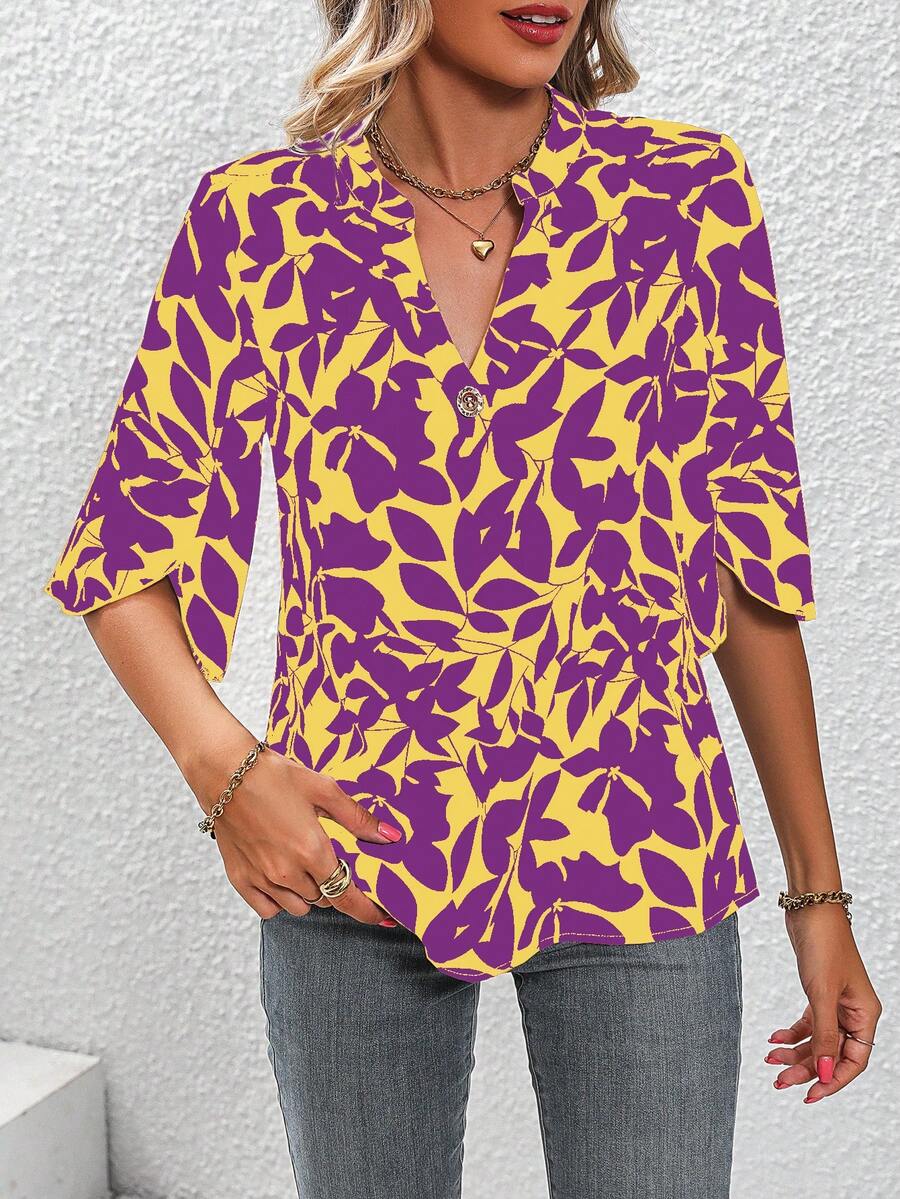 SHEIN LUNE Allover Print Notched Neckline Petal Sleeve Blouse