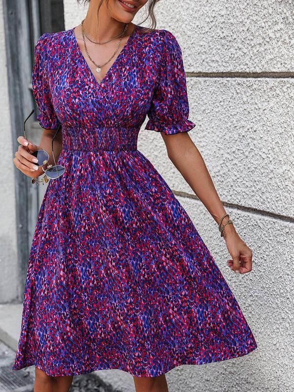SHEIN Privé Allover Print Puff Sleeve Dress