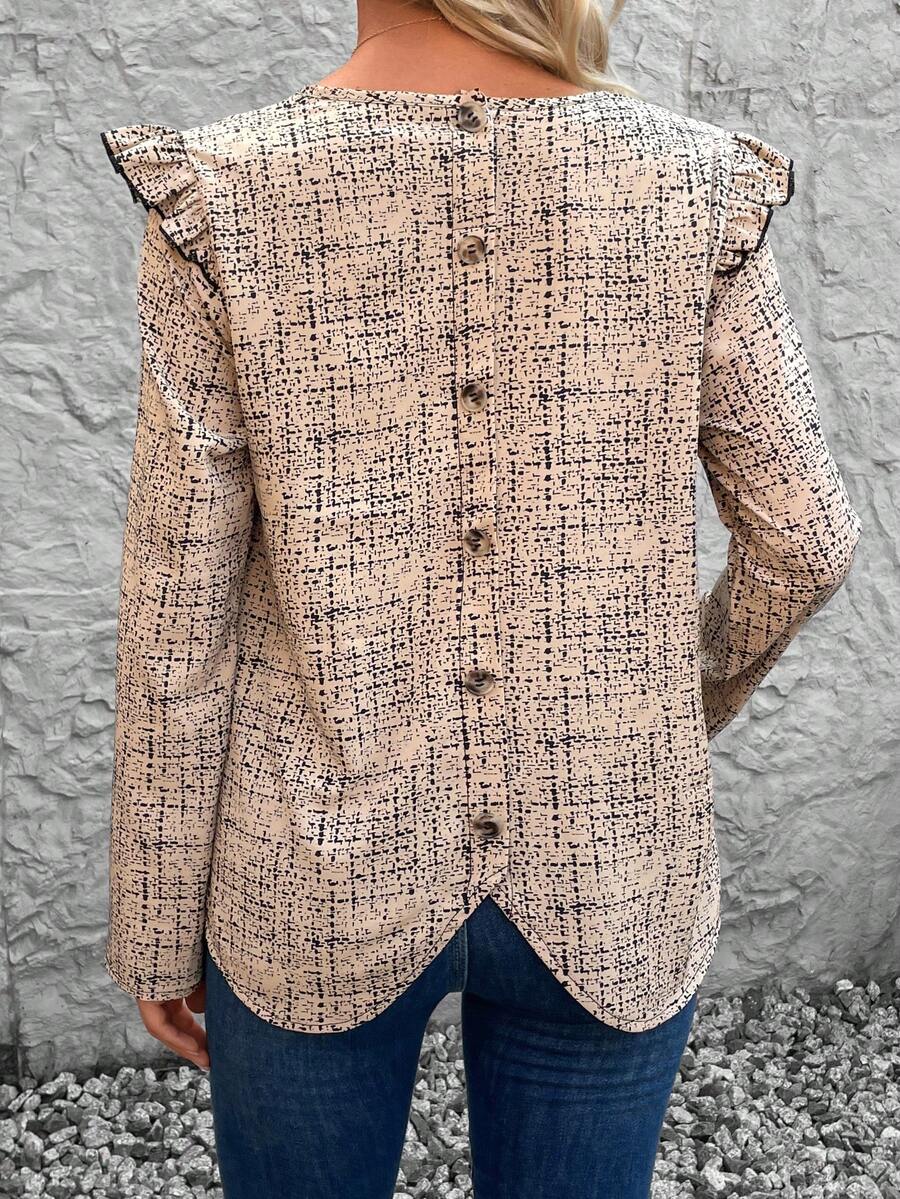 SHEIN Essnce Allover Print Ruffle Trim Button Back Blouse