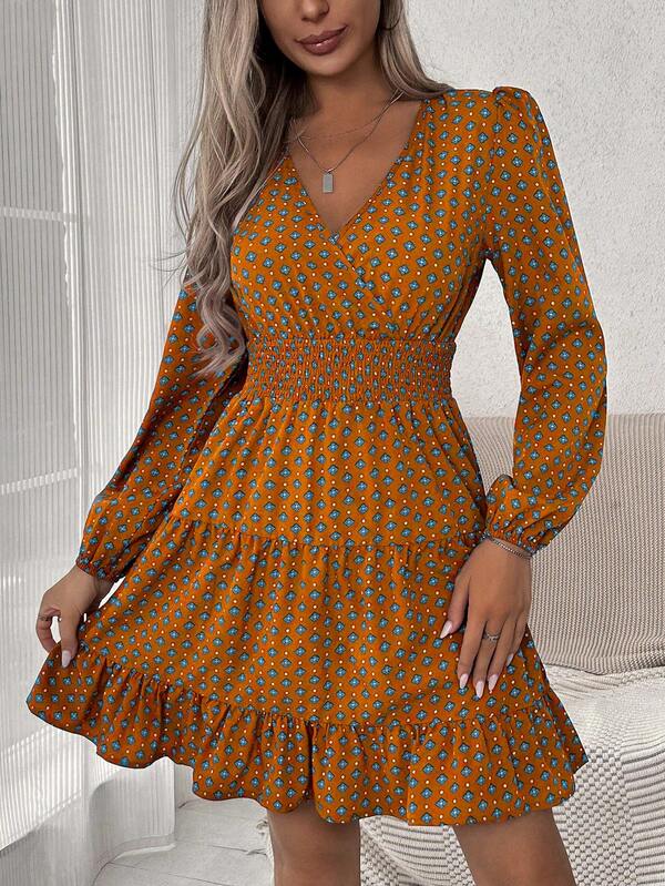 SHEIN LUNE Allover Print Surplice Neck Ruffle Hem Dress