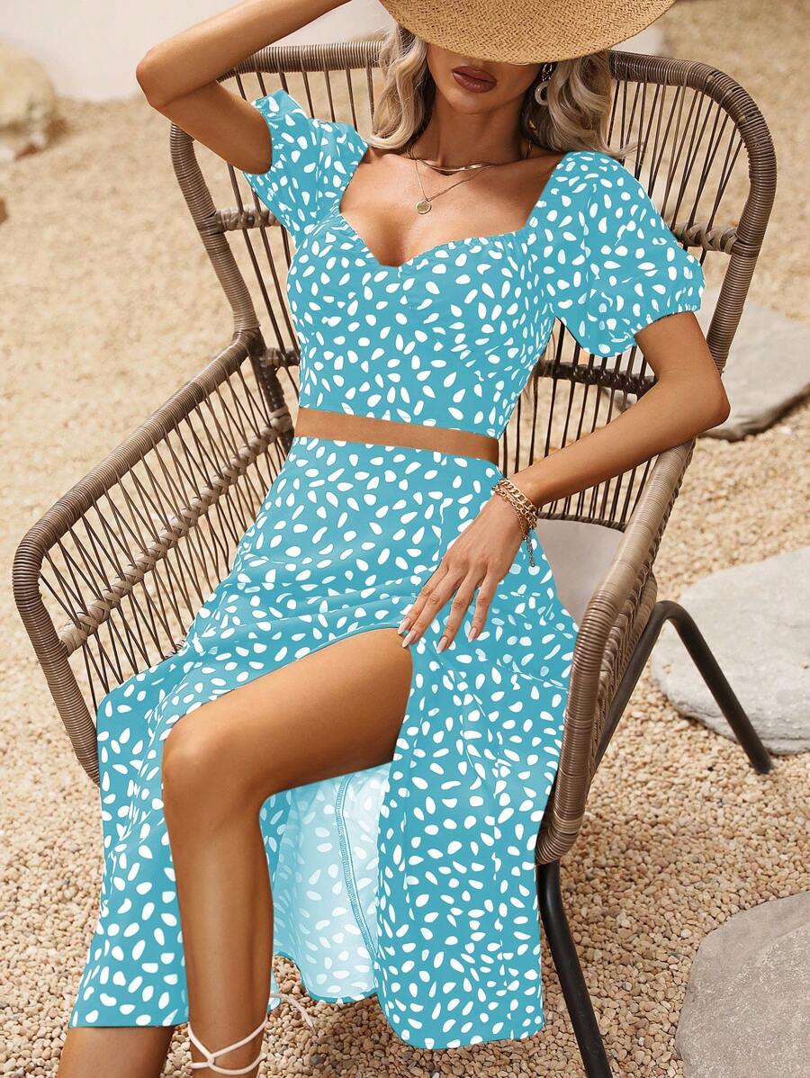 SHEIN VCAY Allover Print Sweetheart Neck Puff Sleeve Crop Top & Split Thigh Skirt