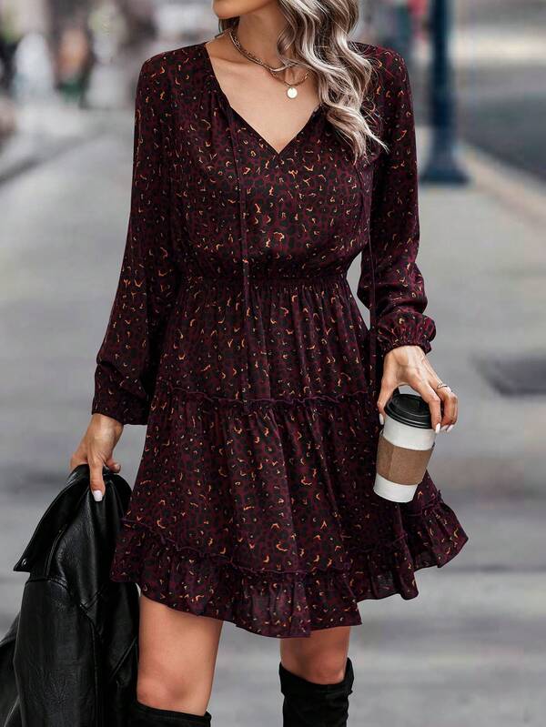 SHEIN LUNE Allover Print Tie Neck Ruffle Hem Dress