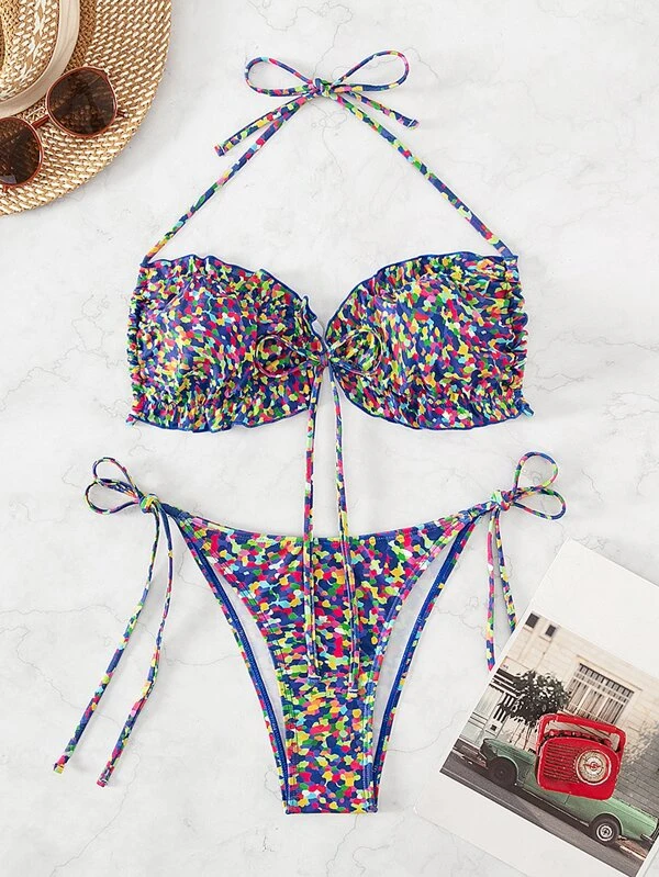 Allover Print Tie Side Halter Bikini Swimsuit