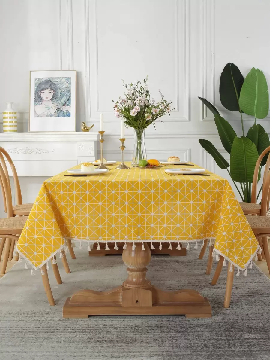 American Bohemian Style Linen Yellow Geometric Rectangle Tablecloth, Suitable For Western Restaurants, Kitchens, Cafes And Parties Decoration, 1pc