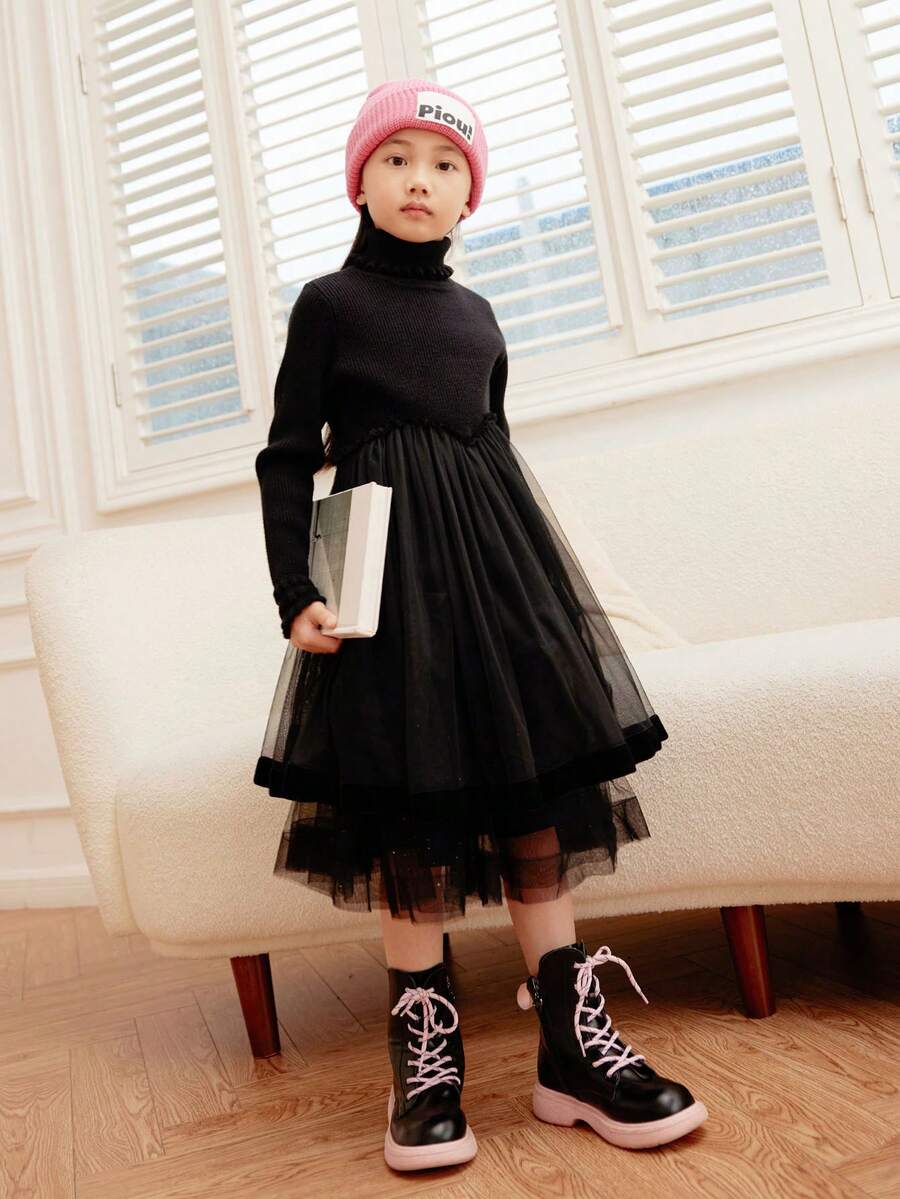 Annil Children's Dress Long Sleeved Sweater Mesh Autumn And Winter Middle School Children's Fashion Sweet Fashionable Princess Dress Black