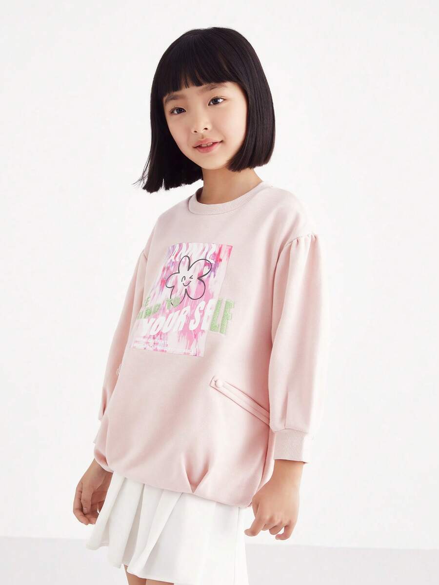 Annil Girls' printed medium length bud shaped loose and cute long sleeved sweater pink