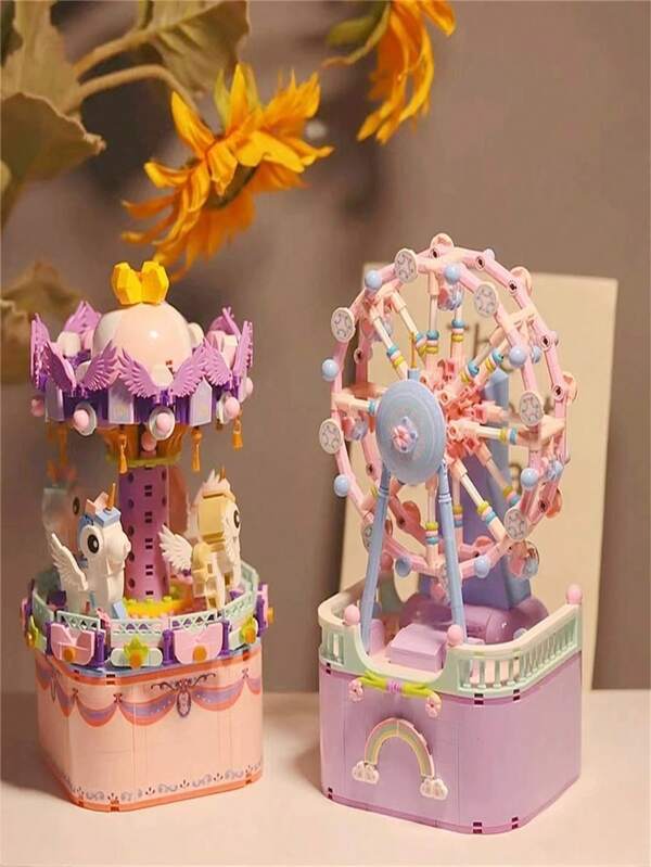 Assembly Particles Music Box Carousel & Ferris Wheel With Gears Brick Toys, Great Gift For Girls