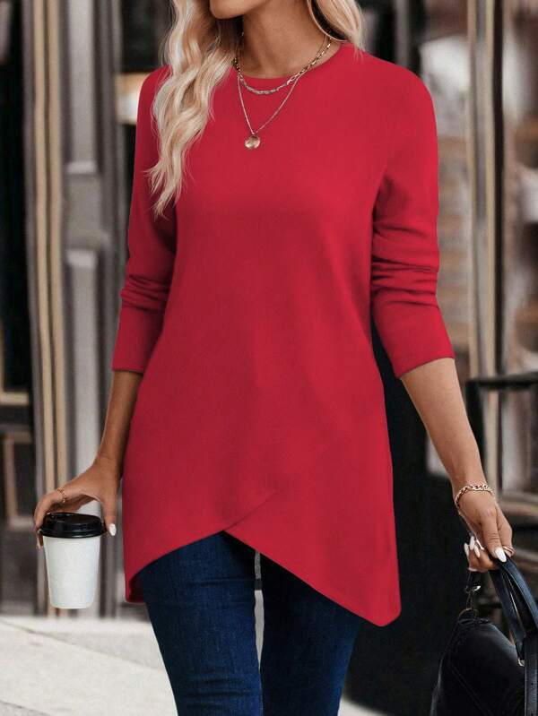 SHEIN LUNE Asymmetric Hem Wrap Detail Round Neck T-Shirt