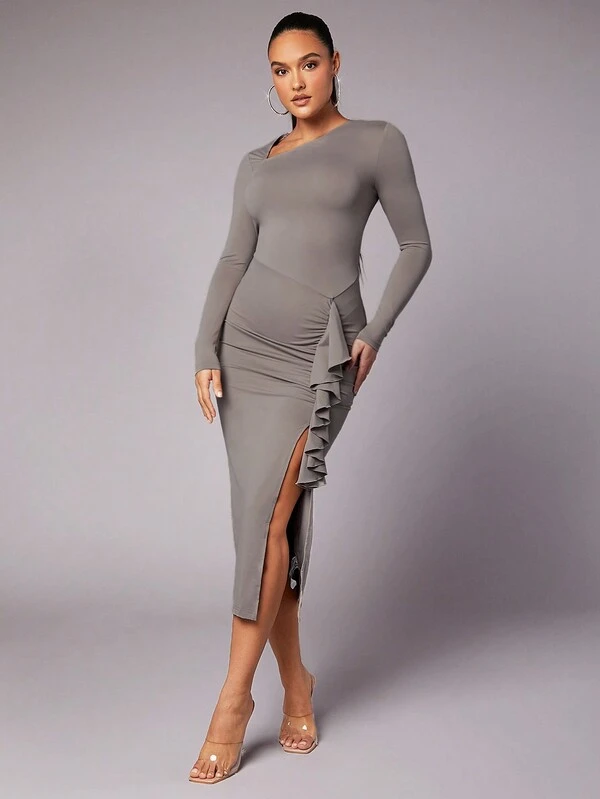 SHEIN BAE Asymmetrical Neck Ruffle Trim Split Thigh Dress