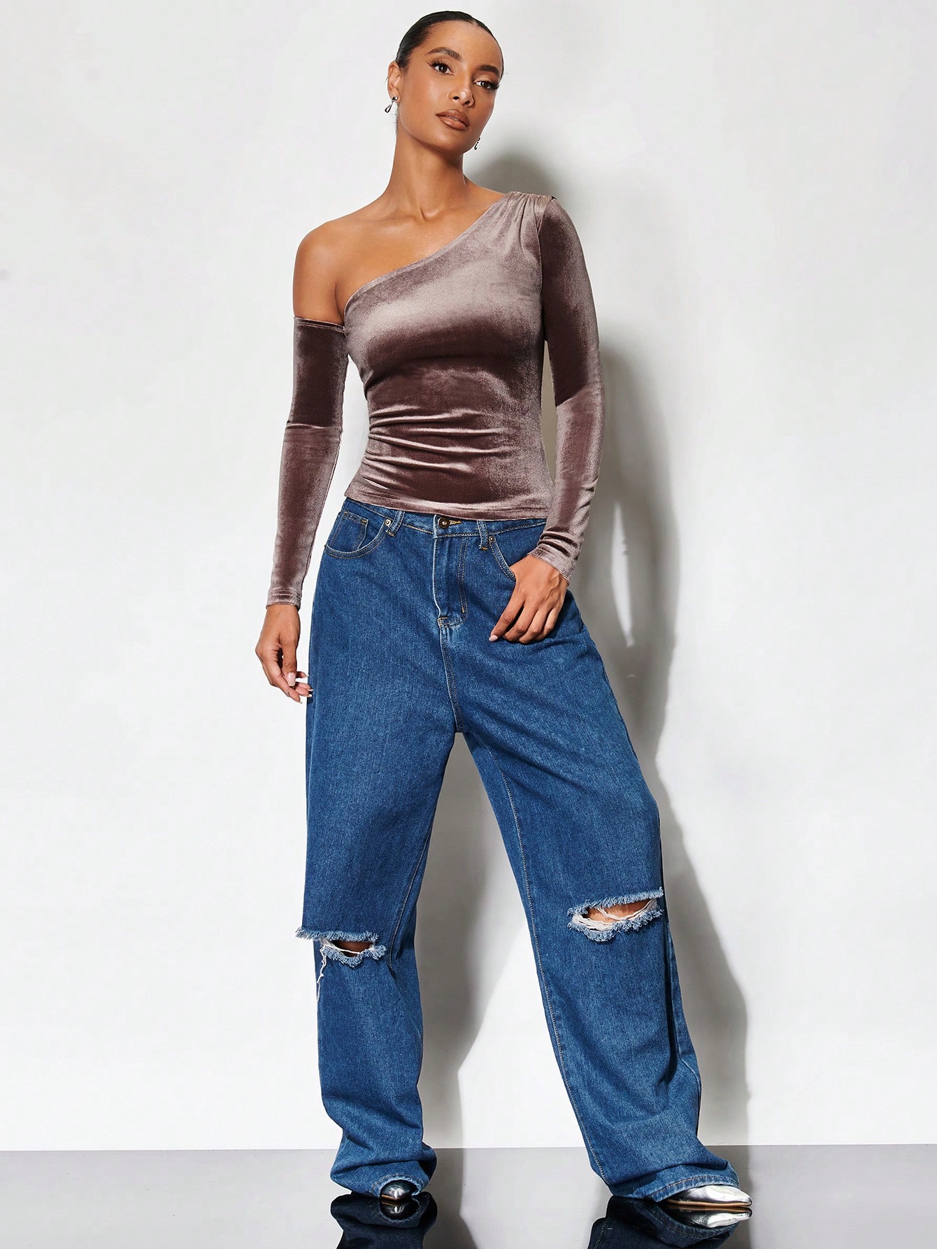 SHEIN BAE Asymmetrical Neck Velvet Tee