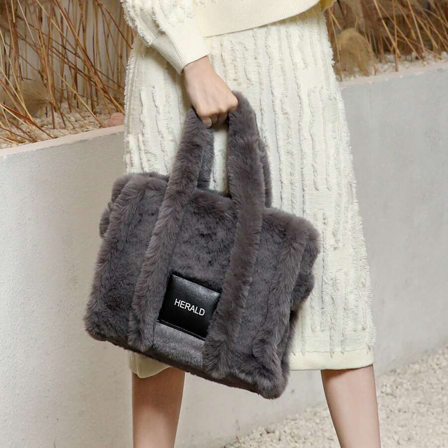 Autumn Winter Large Tote Bags For Women Soft Winter Fluffy Fuzzy Furry Plush Top Handle Purse and Handbag With Shoulder Strap (Grey)