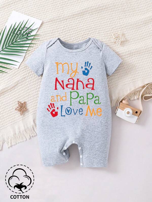 Baby Boy'S Short Sleeved Romper With Slogan Pattern And Short Pants, Casual Style For Home Wear