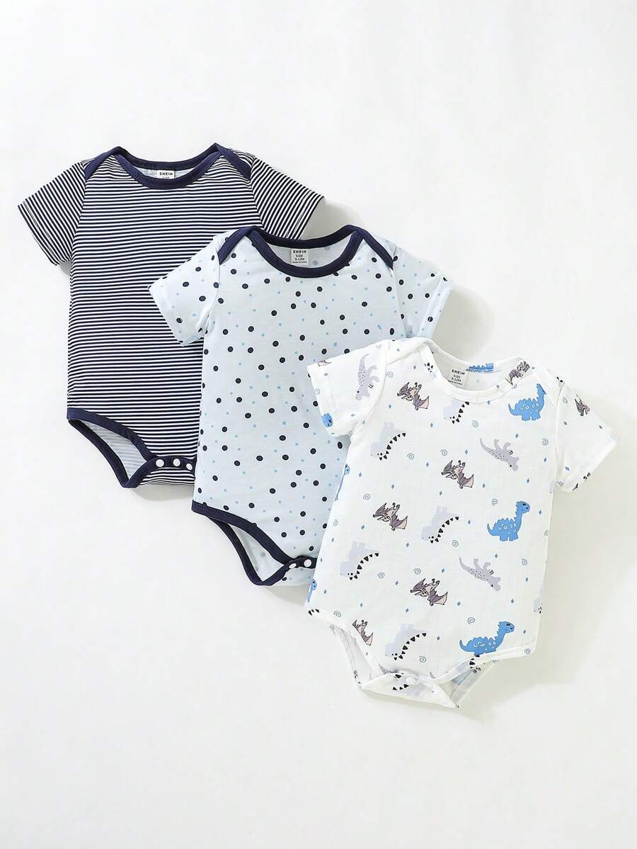 Baby Boy 3pcs Cartoon & Striped Print Contrast Binding Bodysuit