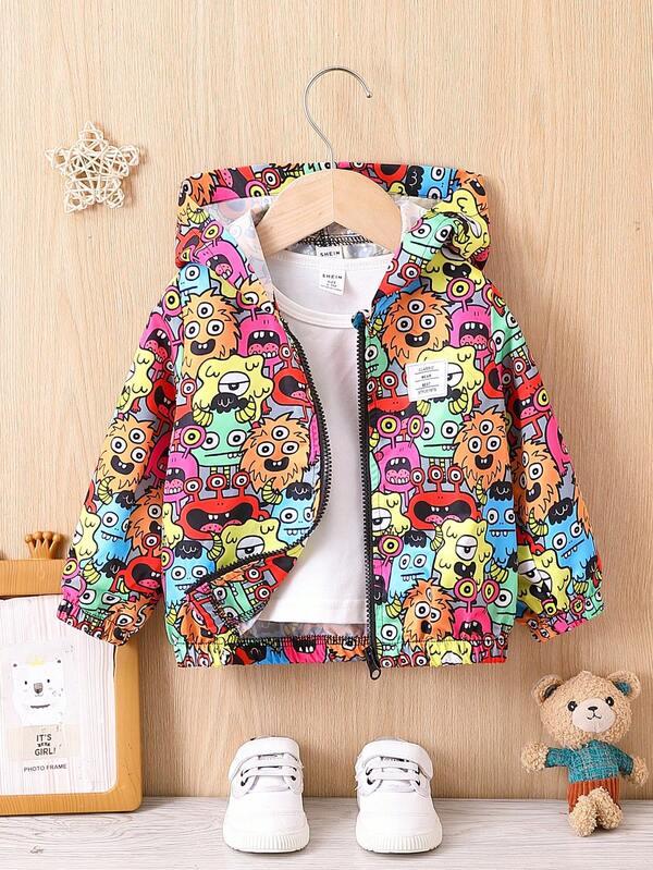 Baby Boy Allover Cartoon Graphic Zip Up Hooded Jacket Without Tee