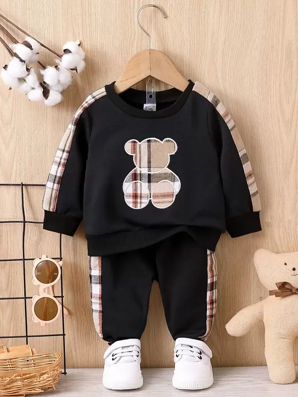 Baby Boy Bear Embroidery Contrast Plaid Side Seam Sweatshirt & Sweatpants