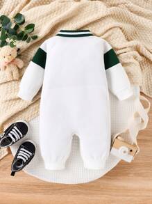 Baby Boy Bear Patched Letter Graphic Contrast Collar Polo Neck Jumpsuit