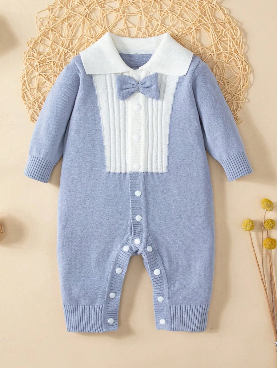 Baby Boy Bow Front Contrast Collar Bow Front Knit Jumpsuit