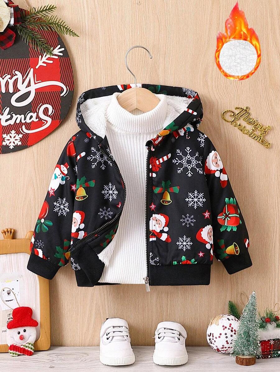Baby Boy Christmas Print Teddy Lined Hooded Jacket Without Sweater