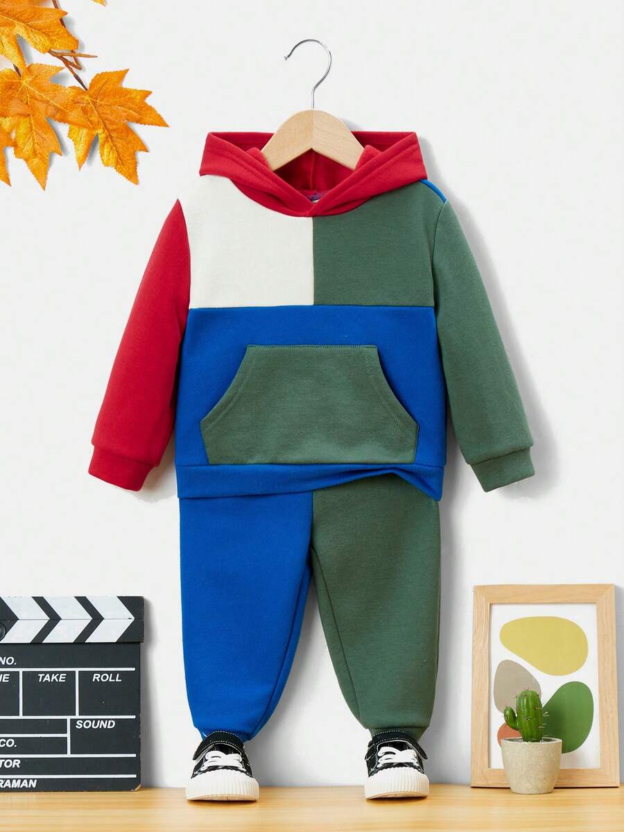 SHEIN Baby Boy Color Block Kangaroo Pocket Hoodie & Sweatpants