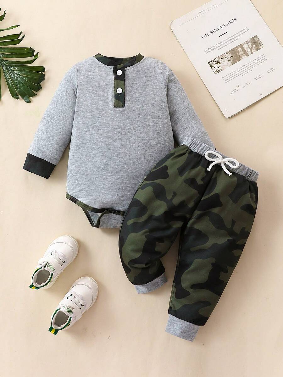 SHEIN Baby Boy Contrast Binding Bodysuit & Camo Print Sweatpants