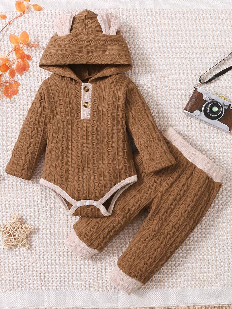 Baby Boy Contrast Trim 3D Ear Design Hooded Bodysuit & Sweatpants
