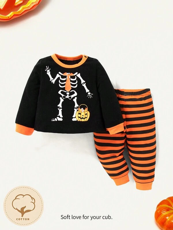 Cozy Cub Baby Boy Halloween Printed Red & Black Color Block Top And Striped Pants Set
