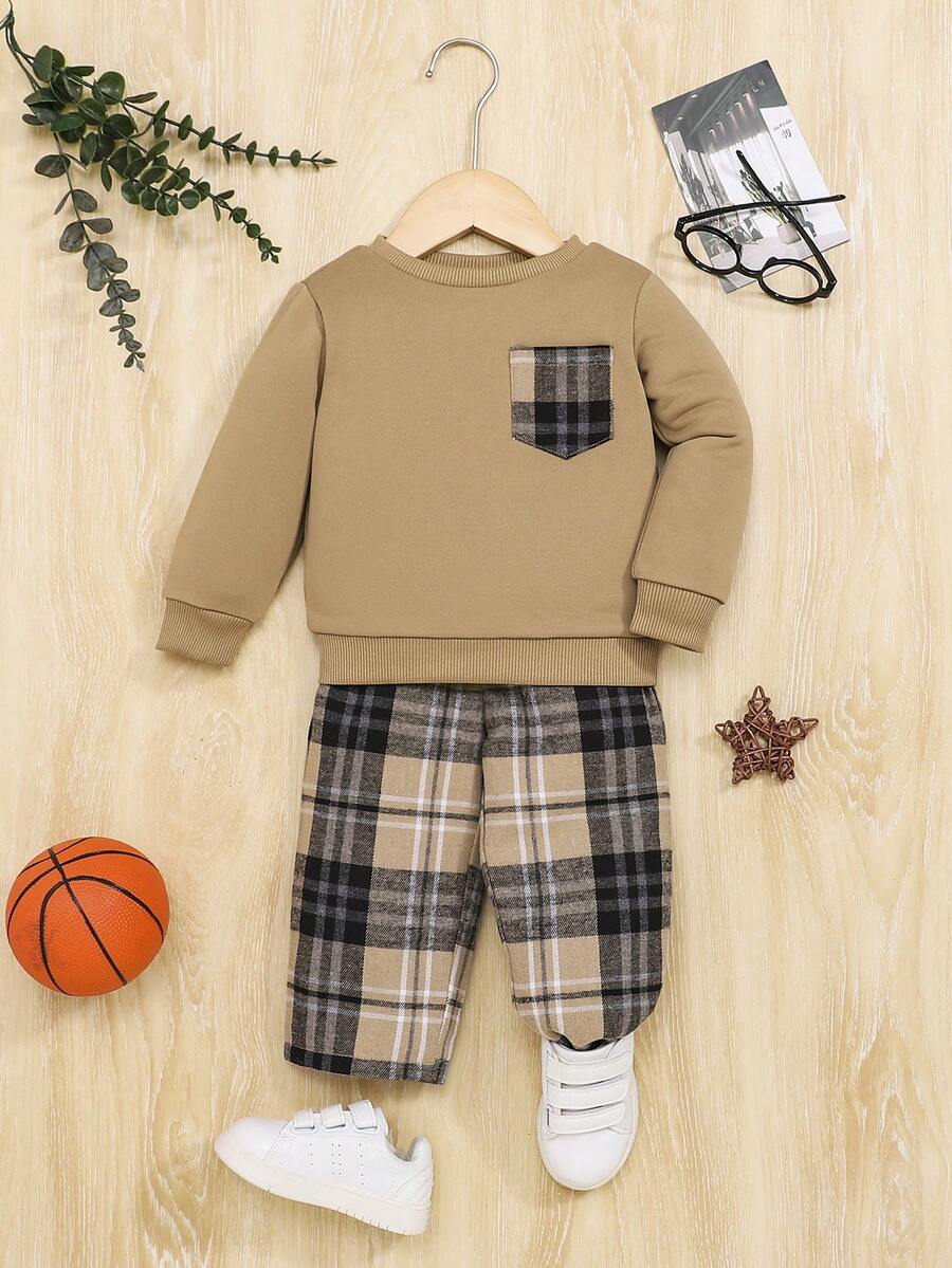 SHEIN Baby Boy Plaid Patched Pocket Pullover & Pants
