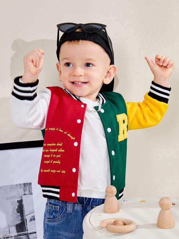 Baby Boy Slogan Graphic Patched Detail Colorblock Varsity Jacket