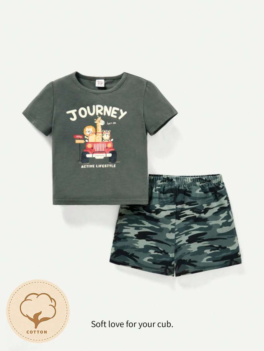 Cozy Cub Baby Boys' Cartoon Animal Pattern Short Sleeve Round Neck Top And Camouflage Shorts Set