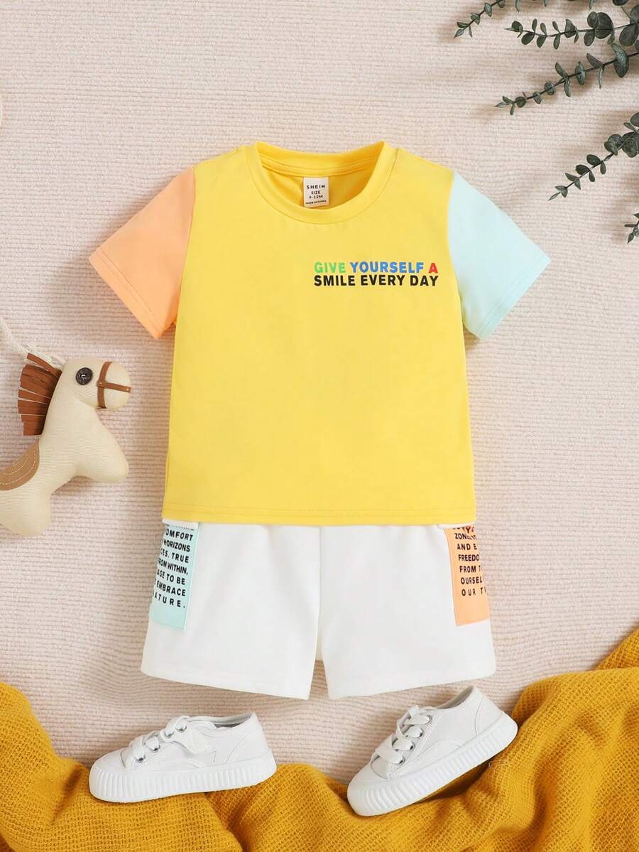 SHEIN Baby Boys' Letter Pattern Round Neck Colorblocked Pullover And Shorts Set