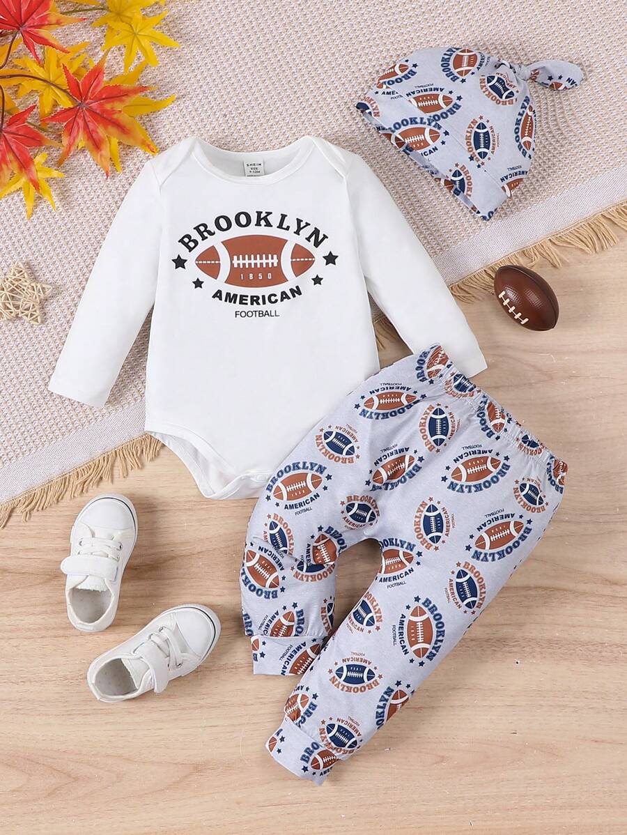 SHEIN Baby Boys' Letter Printed Romper And Pants Casual Daily Outfit Set